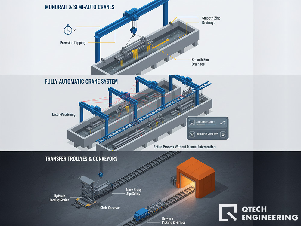 - Monorail & Semi-Auto Cranes: Designed for precision dipping with “slow withdrawal” capabilities to ensure smooth zinc drainage.